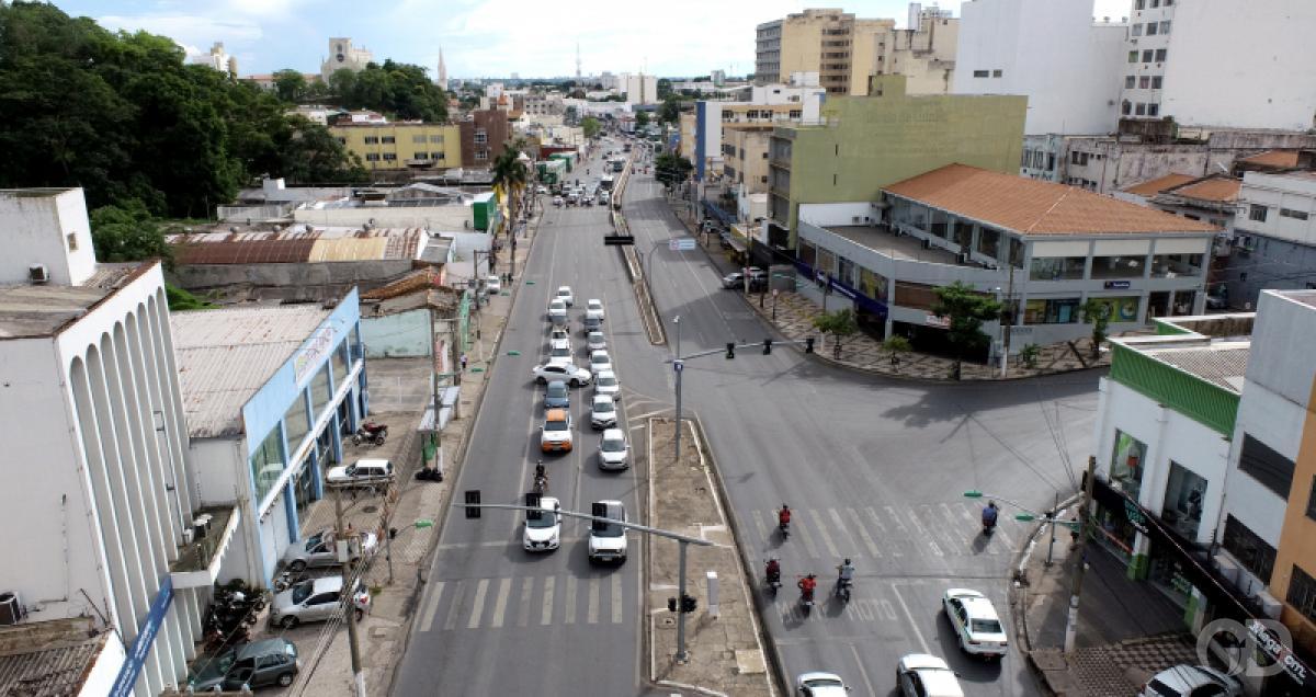 Abaixo uma imagem aérea de Cuiabá na região central onde, ao fundo aparece, a a torre da Igreja de Nossa Senhora do Rosário e São Benedito.