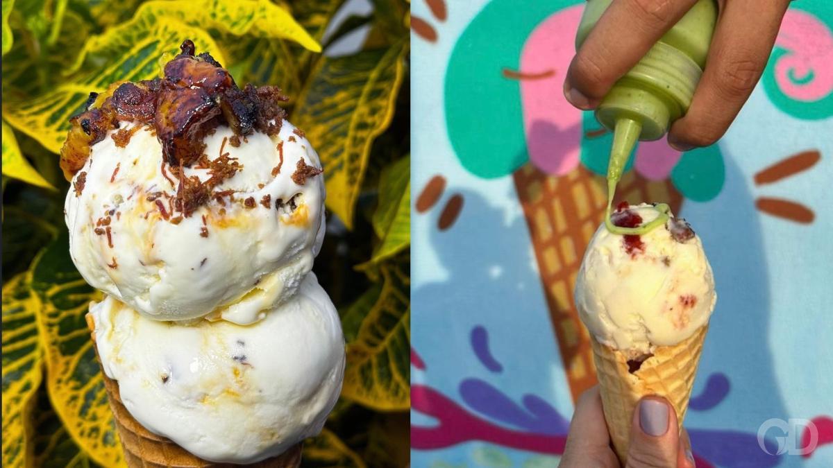 Entre as criações, o gelato de Baguncinha chama atenção pela ousadia ao reinterpretar, em versão doce, de um dos lanches mais tradicionais da cidade. Ingredientes inusitados são usados no preparo, como gelato de nata, vinagre balsâmico, geleia de tomate com morango e bacon caramelizado. E, por cima, a tradicional ‘maionese temperada’ que na verdade é uma calda de pistache.