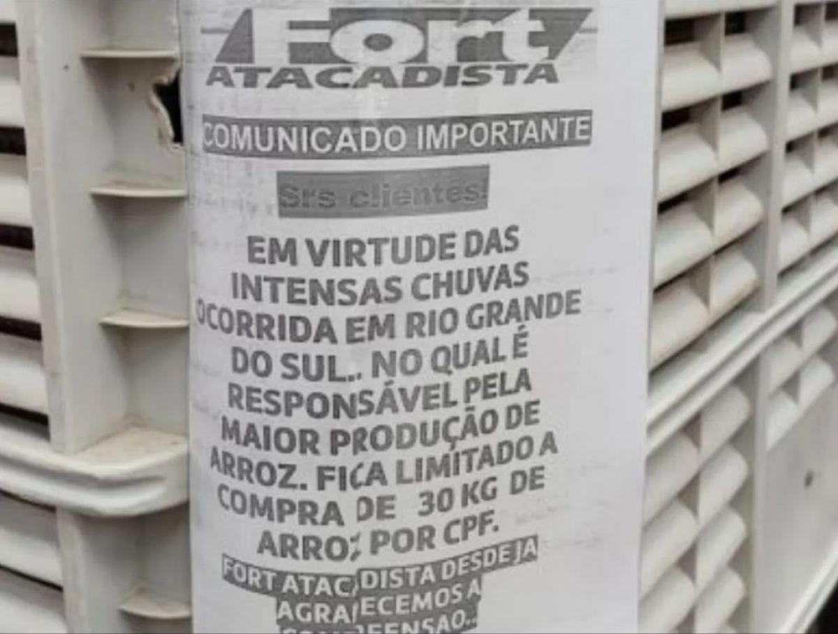 "Em virtude das intensas chuvas ocorridas no Rio Grande do Sul, no qual é responsável pela maior produção de arroz, fica limitado a compra de 30 kg de arroz por CPF", diz aviso de um estabelecimento.