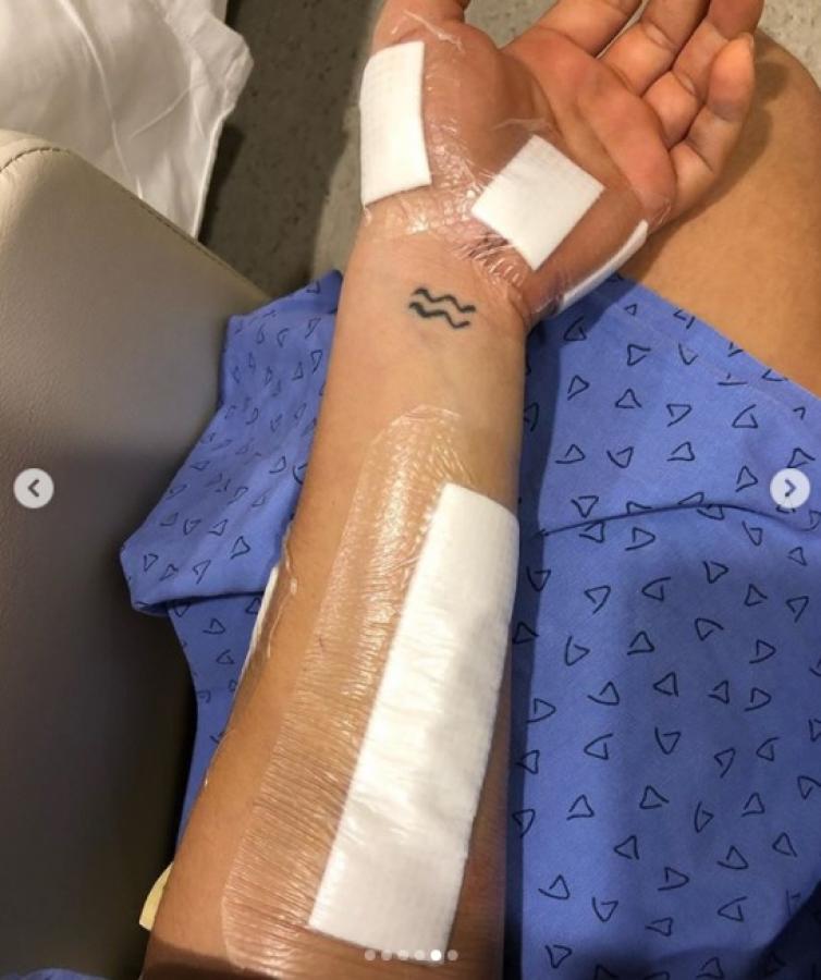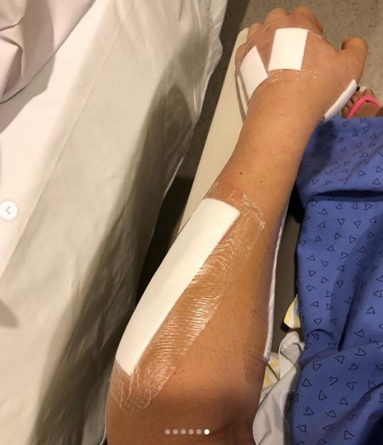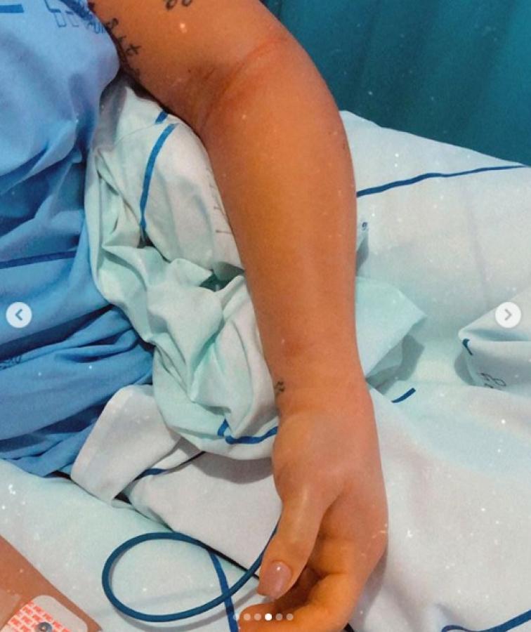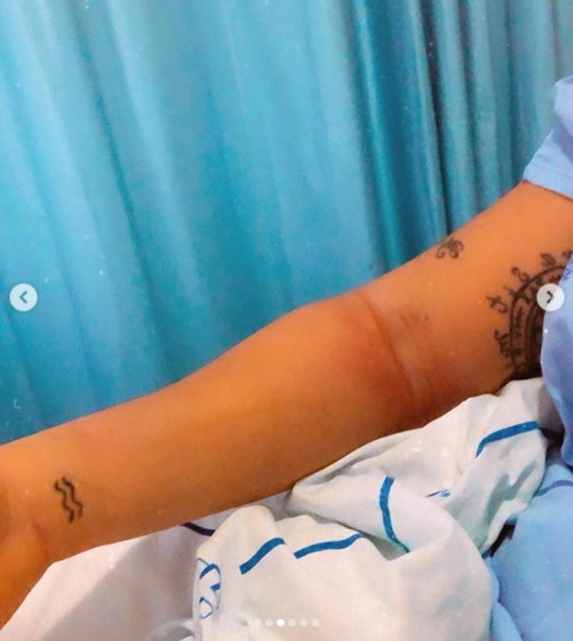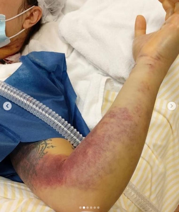 Ainda nas redes, ela mostrou fotos dos ferimentos e as consequências das picadas da jaracaca no pescoço e no braço.