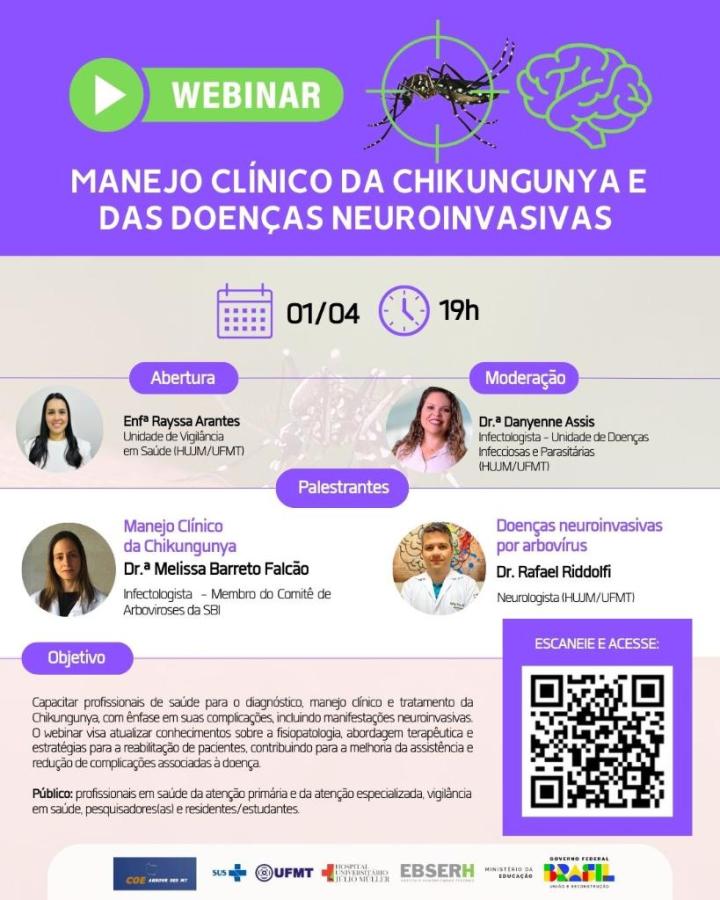 Já a infectologista Melissa Barreto Falcão, membro do Comitê de Arbovirores da Sociedade Brasileira de Infectologia (SBI), fará a palestra sobre o manejo clínico da chikungunya; o neurologista do Hospital Universitário Júlio Muller, Rafael Riddolfi, palestrará sobre as doenças neuroinvasivas por arbovírus e a infectologista Danyenne Assis, da Unidade de Doenças Infecciosas e Parasitárias do hospital, fará a moderação do evento.