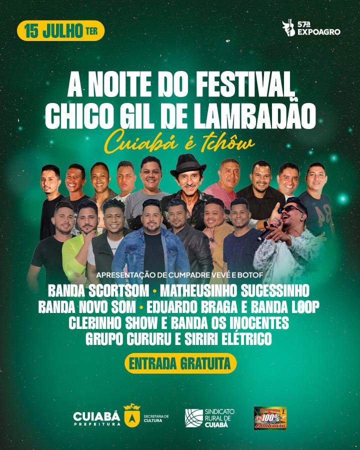 A programação terá início às 21h, com interação dos apresentadores Vevé e Botof e apresentações de Siriri e Cururu Elétrico, simbolizando a conexão entre tradição e modernidade. A partir das 21h45, o Festival Chico Gil entra em cena com uma sequência de shows que promete manter o público animado até a madrugada.