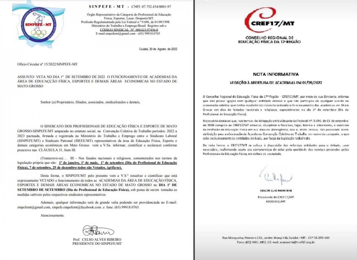 “Desta forma, o SINPEFE/MT pelo presente vem a V.S.ª ressalvar e cientificar que está expressamente VETADO o funcionamento de todos as ACADEMIAS DA ÁREA DE EDUCAÇÃO FÍSICA, ESPORTES E DEMAIS ÁREAS ECONOMICAS NO ESTADO DE MATO GROSSO No DIA 1º DE SETEMBRO DE SETEMBRO (Dia do Profissional de Educação Física), sob penas de serem tomadas as medidas cabíveis pelos respectivos sindicatos representativos”, cita o documento.