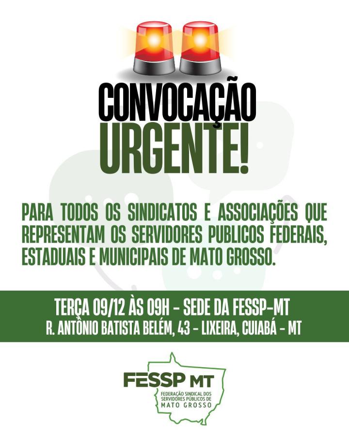 A Federação Sindical dos Servidores Públicos de Mato Grosso (FESSP-MT), em apoio ao Sindicato dos Servidores do Poder Judiciário (Sinjusmat), convocou em caráter emergencial todas as entidades sindicais e associativas que representam trabalhadores do serviço público municipal, estadual e federal para uma reunião que irá definir os próximos passos das categorias. O encontro será realizado na próxima terça-feira (9), às 9h, na sede da Federação, em Cuiabá.
