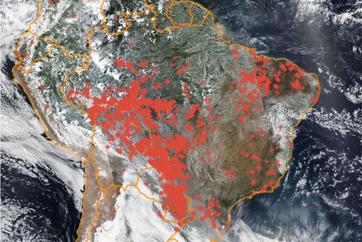 Imagem de satélite do Instituto Nacional de Pesquisas Espaciais (INPE); a cruz vermelha representa queimada, que estão acumuladas em Mato Grosso