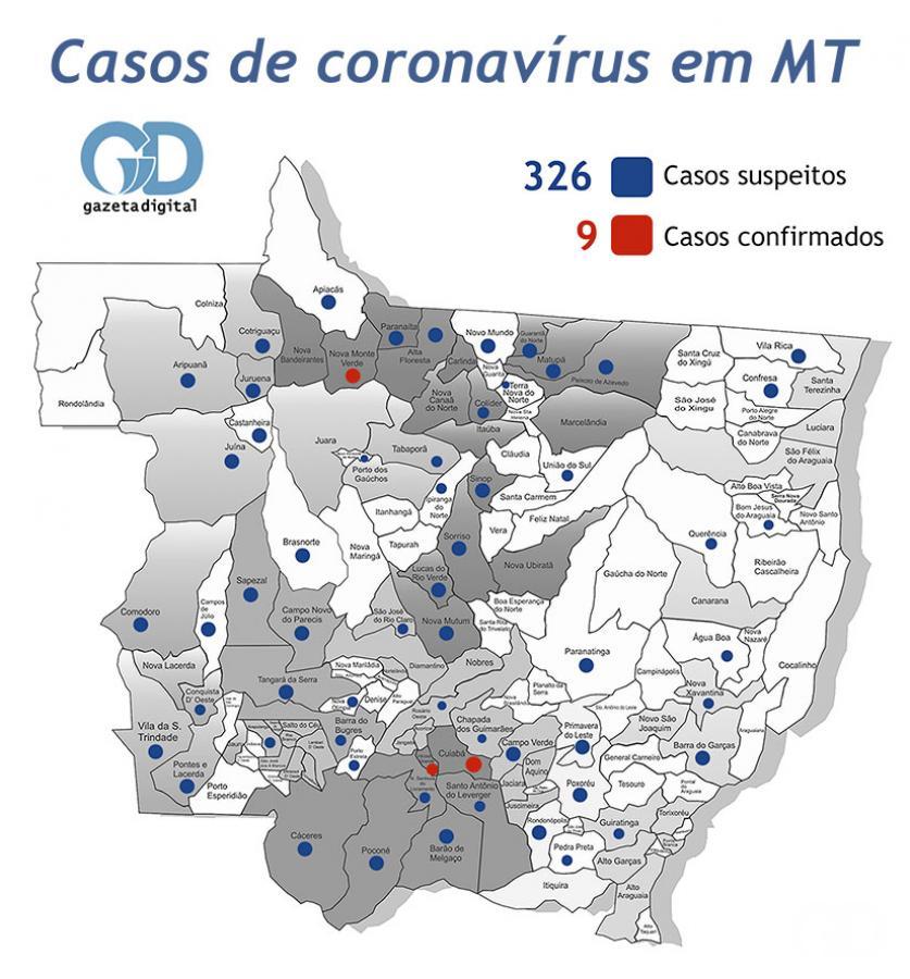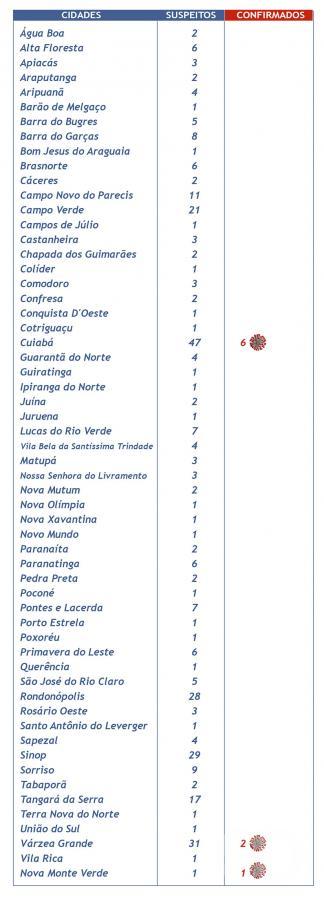 As cidades com mais casos suspeitos são Cuiabá (47), Várzea Grande (31), Sinop (29), Rondonópolis (28), Campo Verde (21) e Tangará da Serra (17). Dos 141 municípios, 60 já notificaram o Estado de casos suspeitos da doença. Em todo o país, já são 2433 casos confirmados. Nesta terça (24), eram 7 casos confirmados e 269 suspeitos.