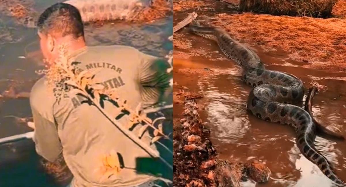 Os policiais do Batalhão de Polícia Militar de Proteção Ambiental (BPMPA) foram acionados para o resgate por proprietários para o resgate de uma serpente da espécie "sucuri".