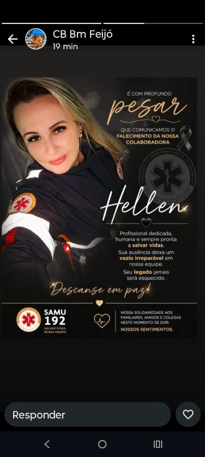 Hellen era servidora do Serviço de Atendimento Móvel de Urgência (Samu) que, por meio de nota, lamentou sua partida. Veja: