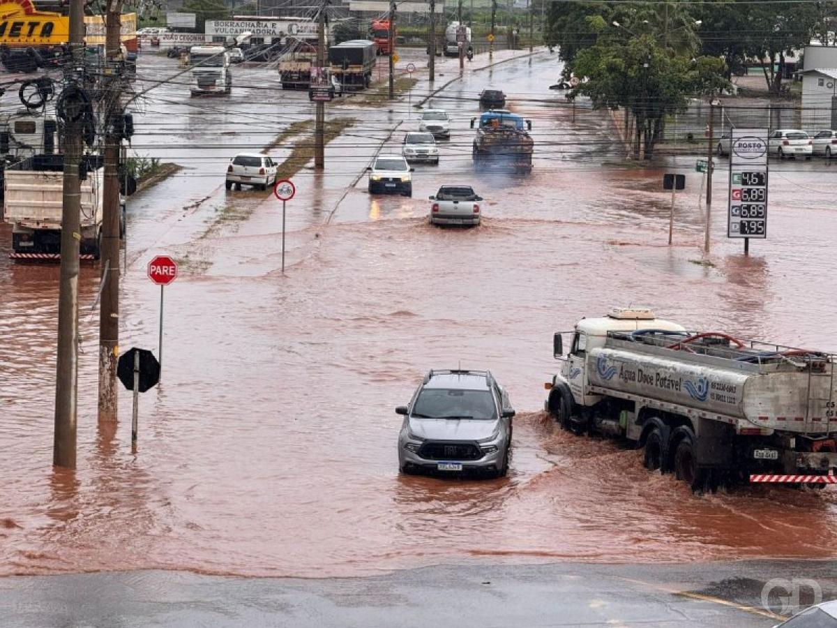 Veículos ficam presos em alagamento durante temporal em Cuiabá