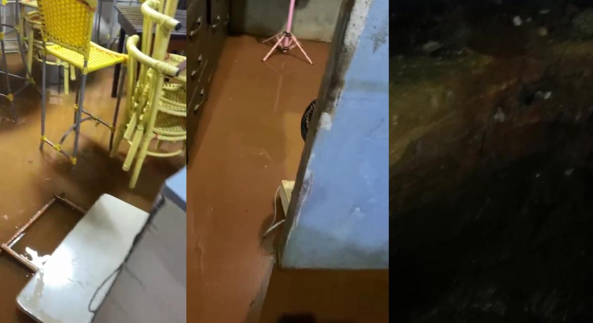 é possível ver que a enxurrada invadiu os bares, localizados em frente à Praça Dom Wunibald. Os proprietários tiveram que erguer os móveis e os freezers para impedir que os objetos fossem danificados.