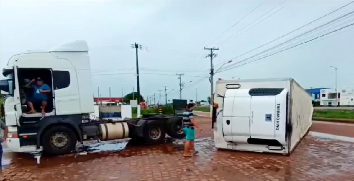 Um vagão de carreta carregado de carne tombou na tarde desse sábado (6), em um posto de combustível, em Sinop (503 km ao norte de Cuiabá).