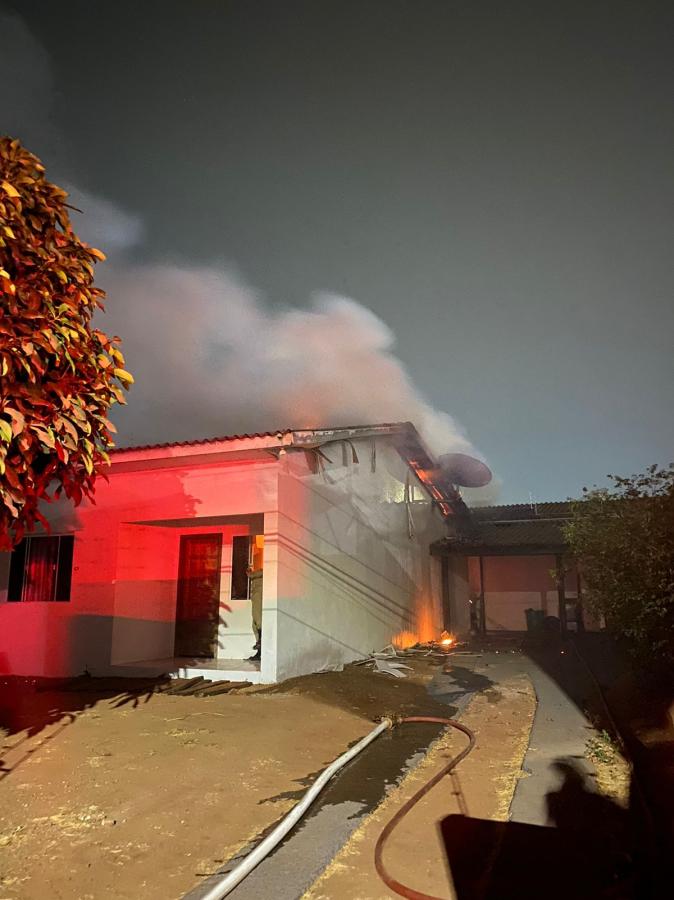 No local, foram informados de que o fogo iniciou na cozinha devido a um vazamento de gás de cozinha, que se espalhou rapidamente pela casa, atingindo eletrodomésticos e móveis.