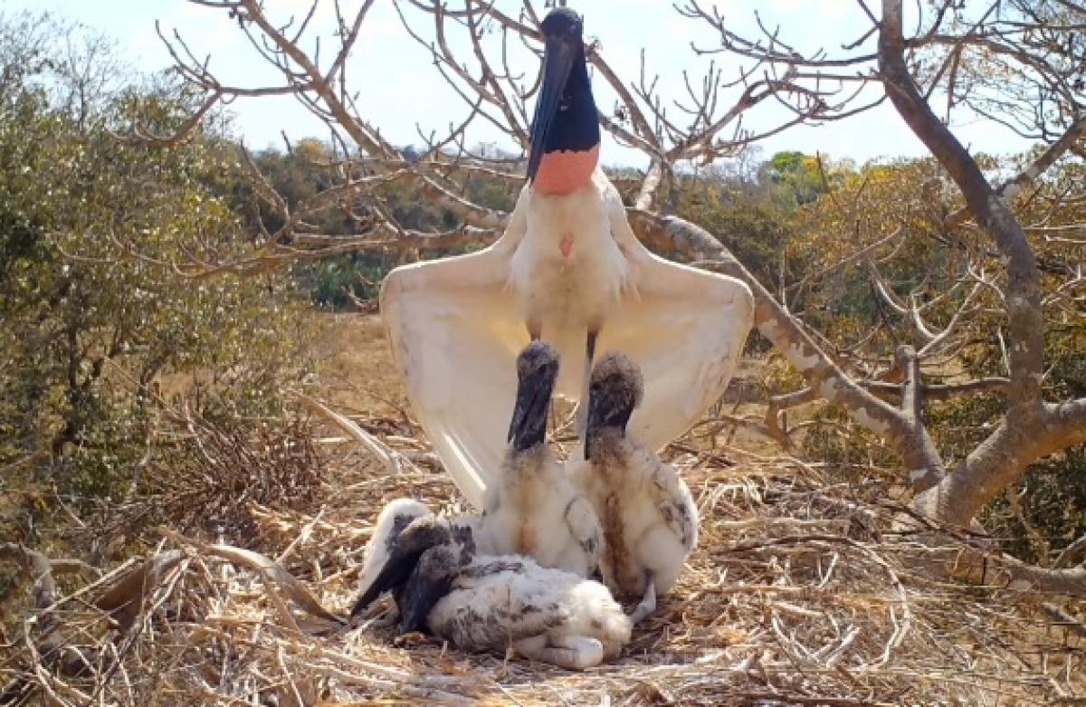 Registro mostra a mãe tuiuiú adulto servindo como "guarda-sol". Com as asas abertas, o animal protege os filhotes do calor intenso no ninho.