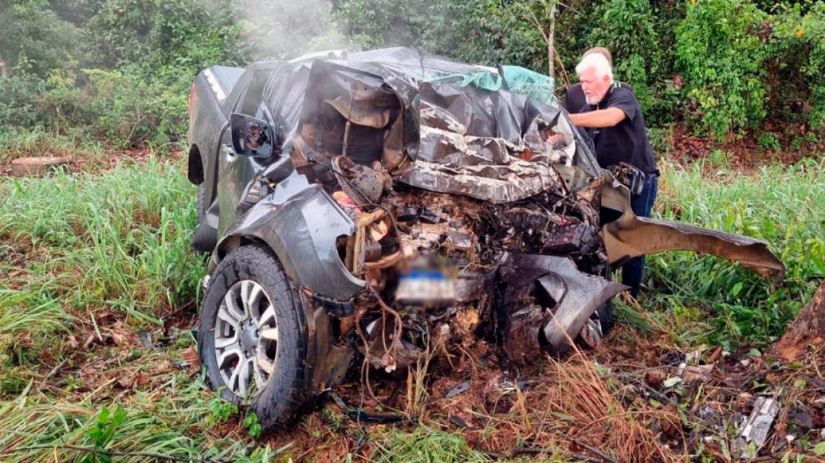 Vídeo gravado as margens MT-251 mostra como ficou a caminhonete Ford Ranger, que colidiu contra uma árvore na manhã deste sábado (9), que liga os municípios de Sinop a Cláudia (600 km ao norte de Cuiabá). O veículo era ocupado por dois homens, que acabaram falecendo no local.
