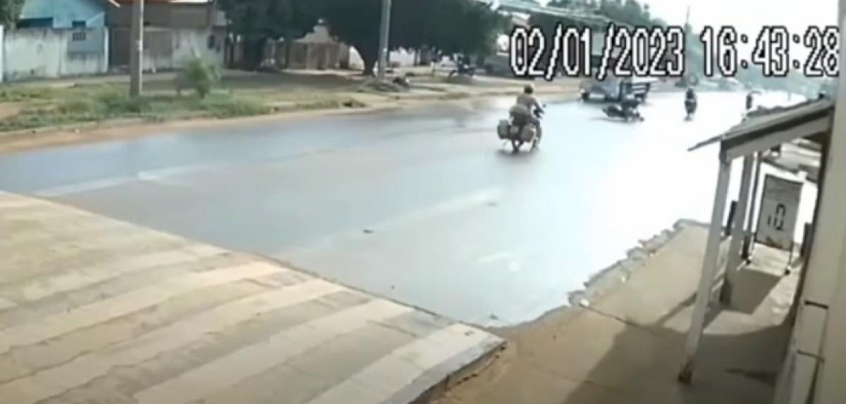 Câmera de segurança registrou o exato momento em que um motociclista "nasceu de novo". Ele saiu ileso de um acidente envolvendo um caminhão, na tarde de segunda-feira (2), na avenida Tancredo Neves, em Cáceres (225 km a oeste). A pista estava molhada no momento do acidente.