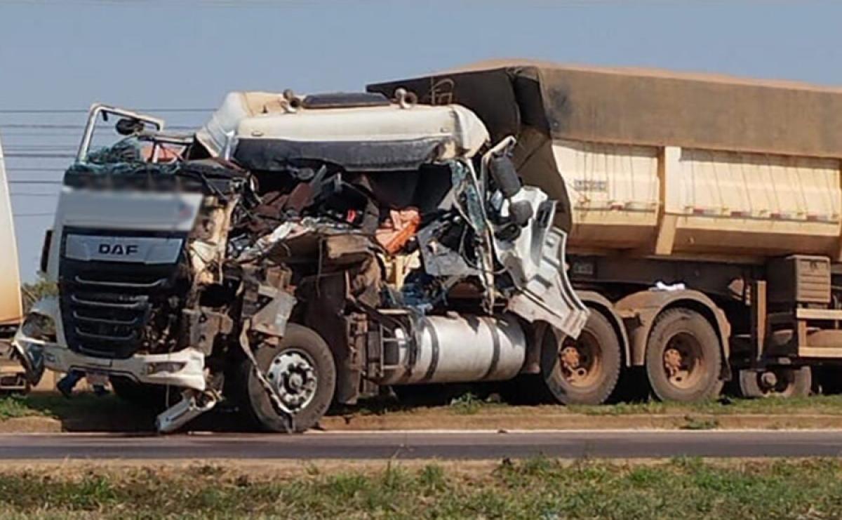 Acidente envolveu 5 carretas em batida traseira e lateral. Com o impacto das batidas, o veículo de carga ficou com a parte dianteira destruída, mas o condutor aparece em vídeos saindo ileso das ferragens.