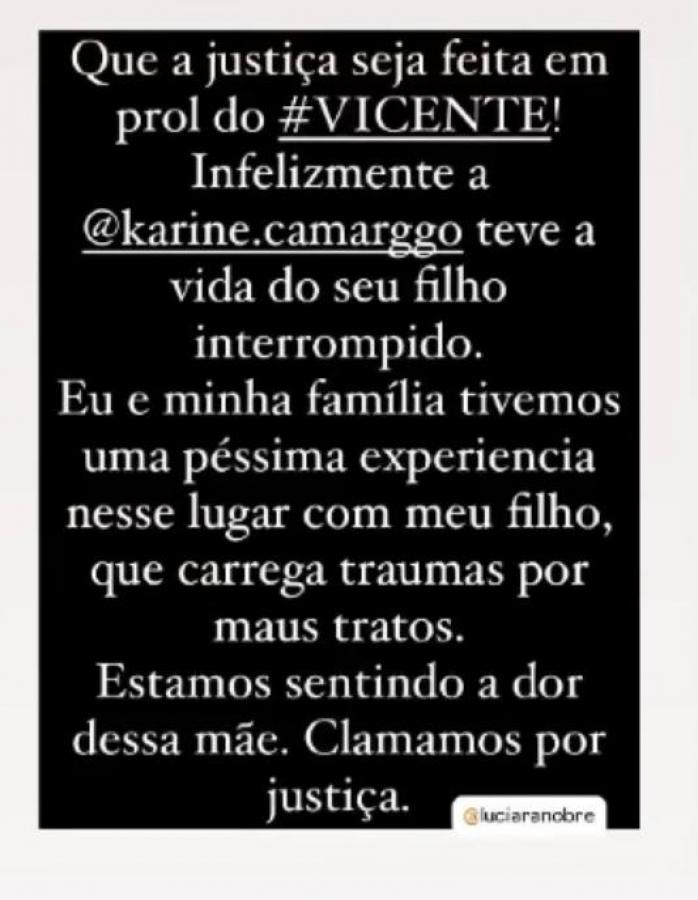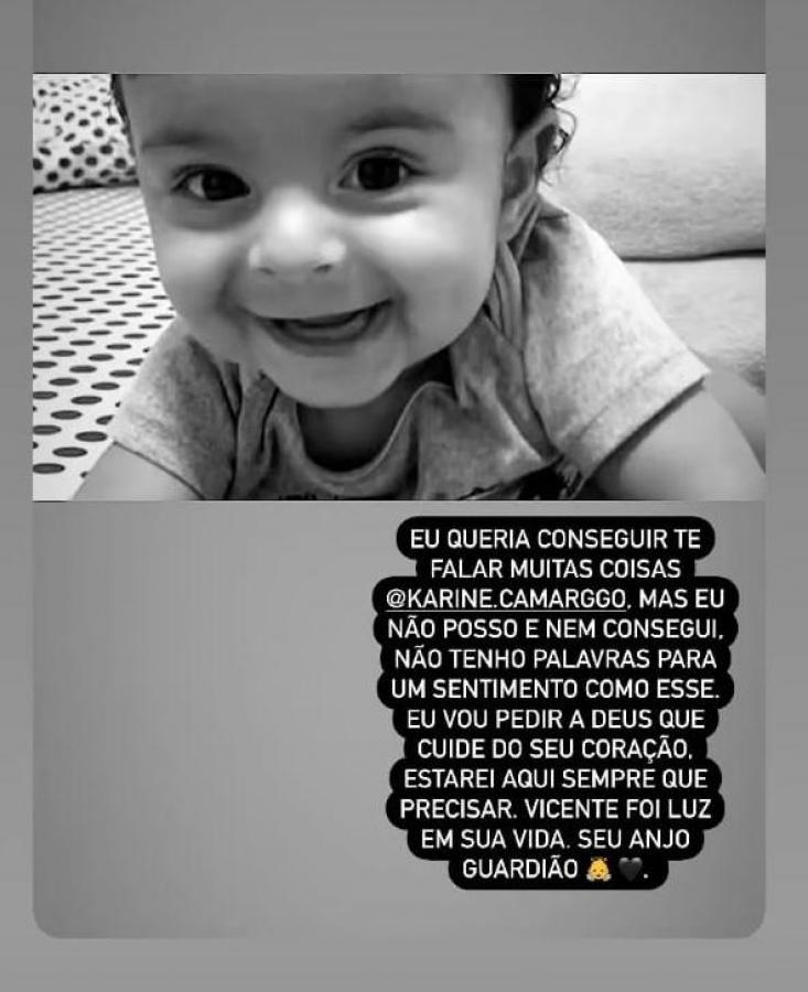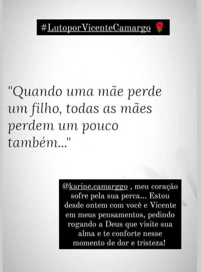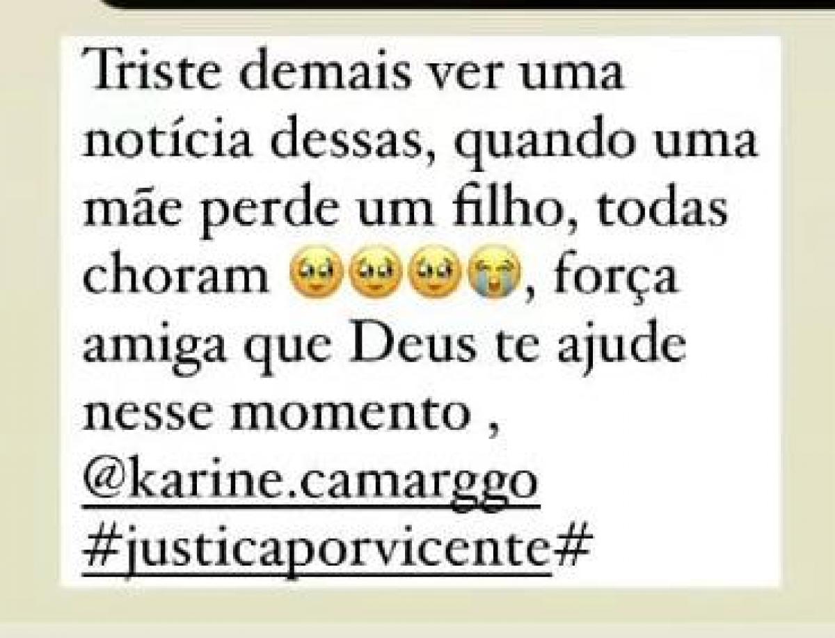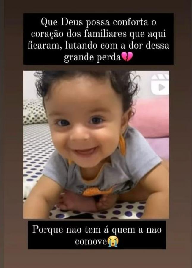 "Quero muito agradecer todas as mensagens de conforto e de carinho, estou em choque, não consigo vir ainda aqui e falar como tudo isso aconteceu. Várias emissoras me procuraram, mas agora meu coração arde e chora, uma dor que sufoca e não consigo falar. Só peço que orem por mim e minha família", disse a mãe do bebê.