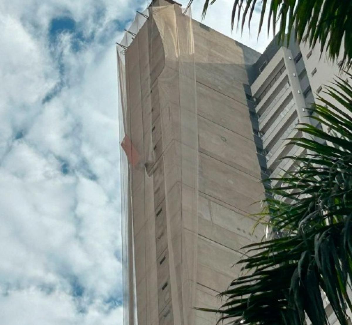 Andaime ficou pendurado, com um trabalhador dentro, na obra de um prédio de luxo, no Goiabeiras, em Cuiabá. O equipamento estava no alto do prédio, que tem mais de 20 andares. Apesar do suspeito, a vítima não se feriu.