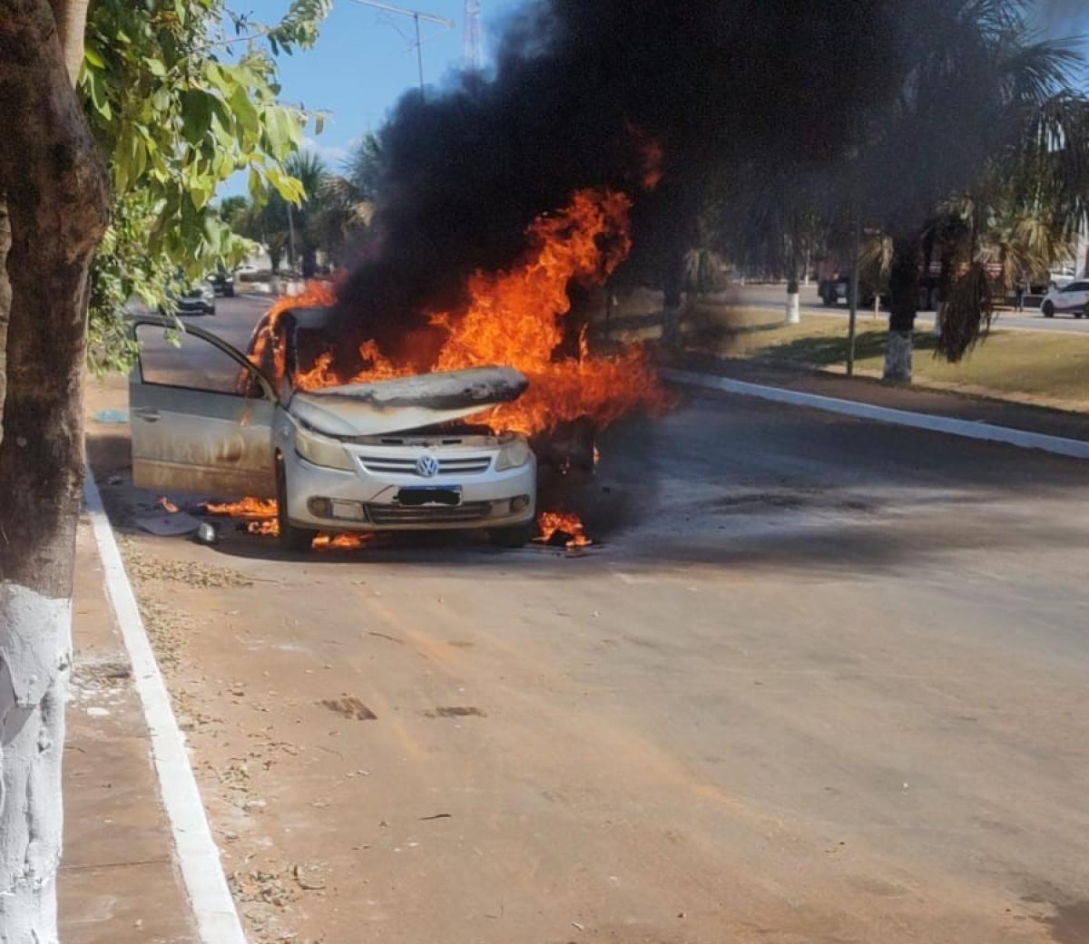Um Gol foi destruído pelo fogo, no final da manhã de segunda-feira (9), próximo ao Estádio Nilo Perin, em Querência (945 km a nordeste de Cuiabá). Apesar dos danos materiais, não houve feridos.