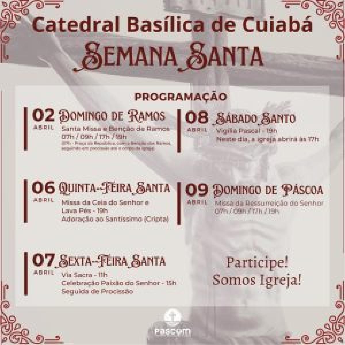 A Semana Santa, período que marca a morte e ressureição de Jesus Cristo, teve início no Domingo de Ramos (02) e se estende até o Domingo de Páscoa (09). A Catedral Basílica do Senhor Bom Jesus de Cuiabá realiza a partir de quinta-feira (06) as celebrações do período mais importante de reflexão da igreja católica.