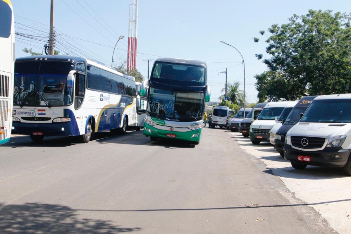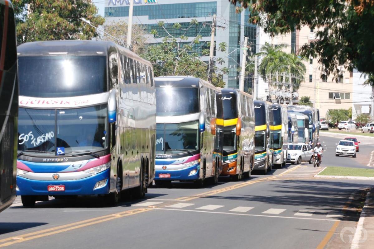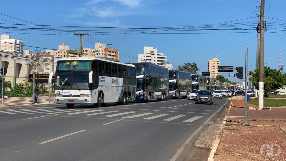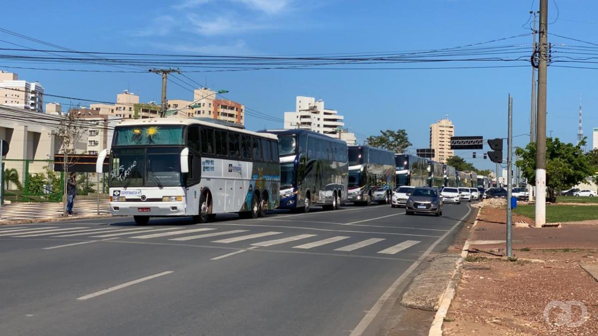 mostra os ônibus e vans utilizados pelos manifestantes para percorreram o trajeto até a Assembleia Legislativa (ALMT). Eles pedem ajuda do governo para pagar custos e conseguir crédito durante a crise causada pelo novo coronavírus.
