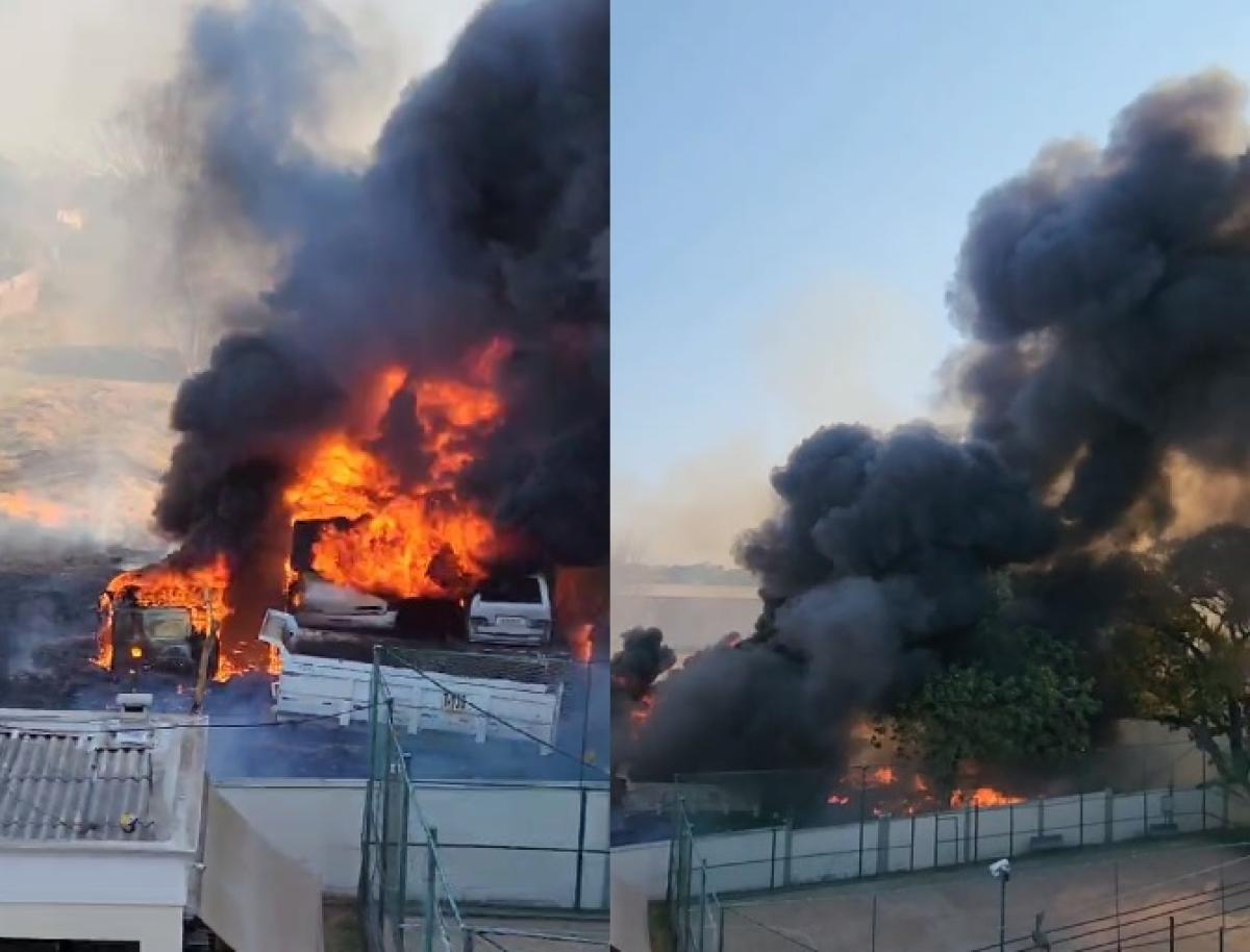 Os registros também mostram automóveis em meio as chamas e uma enorme nuvem de fumaça.