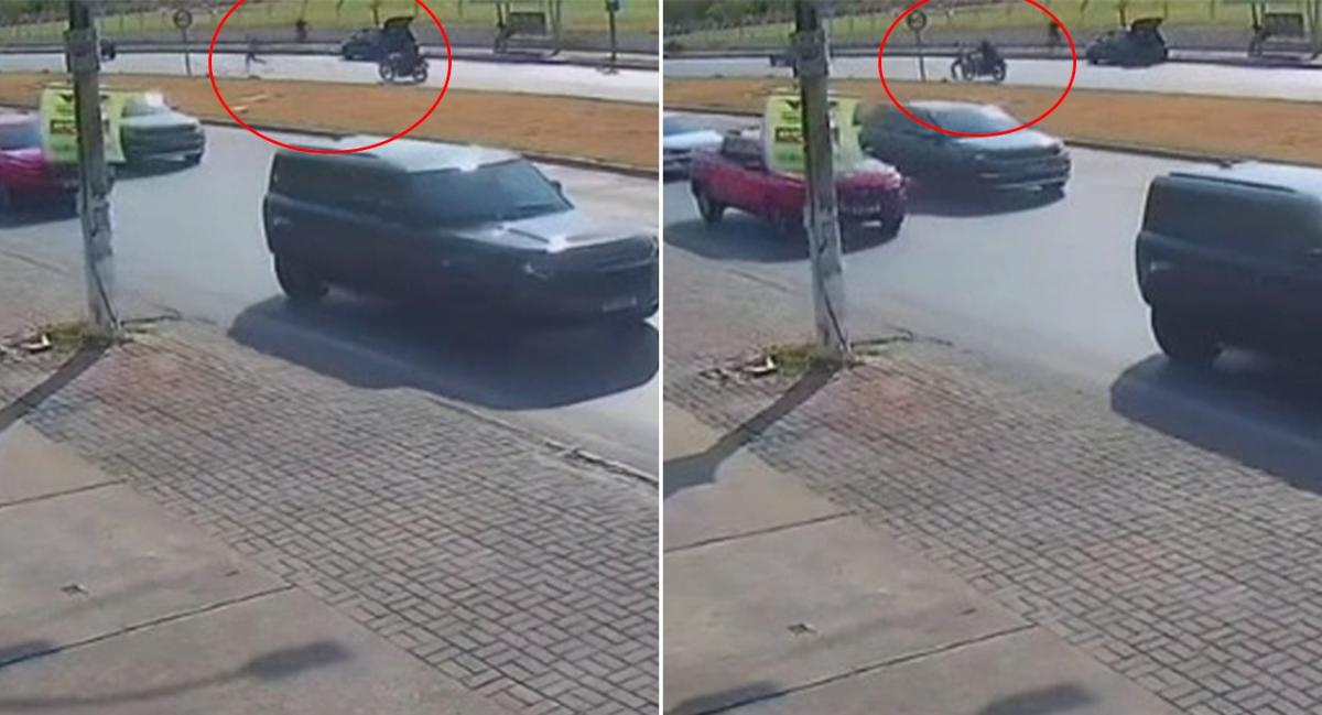 Nas filmagens é possível ver que o homem sai de seu veículo, um Fox preto, estacionado no lado oposto da avenida. Ele corre para tentar atravessar a via, mas é atropelado e arremessado pela moto pouco antes de alcançar o outro lado da pista.