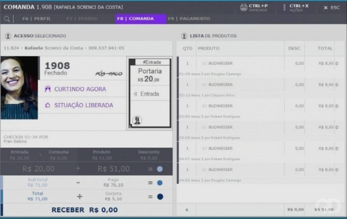 No local em que ocorreu a consumação, na avenida Miguel Sutil, em Cuiabá, imagens do circuito interno mostram a professora indo ao banheiro, com sinais de embriaguez e passando mal. Ela é acompanhada por um homem que trabalha como segurança do estabelecimento.