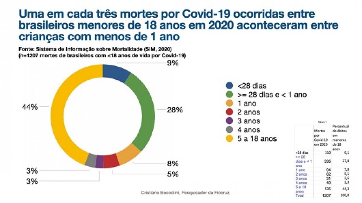 Estudo inédito da Fundação Oswaldo Cruz (Fiocruz) demonstrou que quase metade das crianças e adolescentes brasileiros mortos por covid-19 tinham até 2 anos, em 2020. Segundo os dados, um terço de óbitos até 18 anos ocorreram entre os menos de 1 ano e 9% entre bebês com menos de 28 dias de vida.