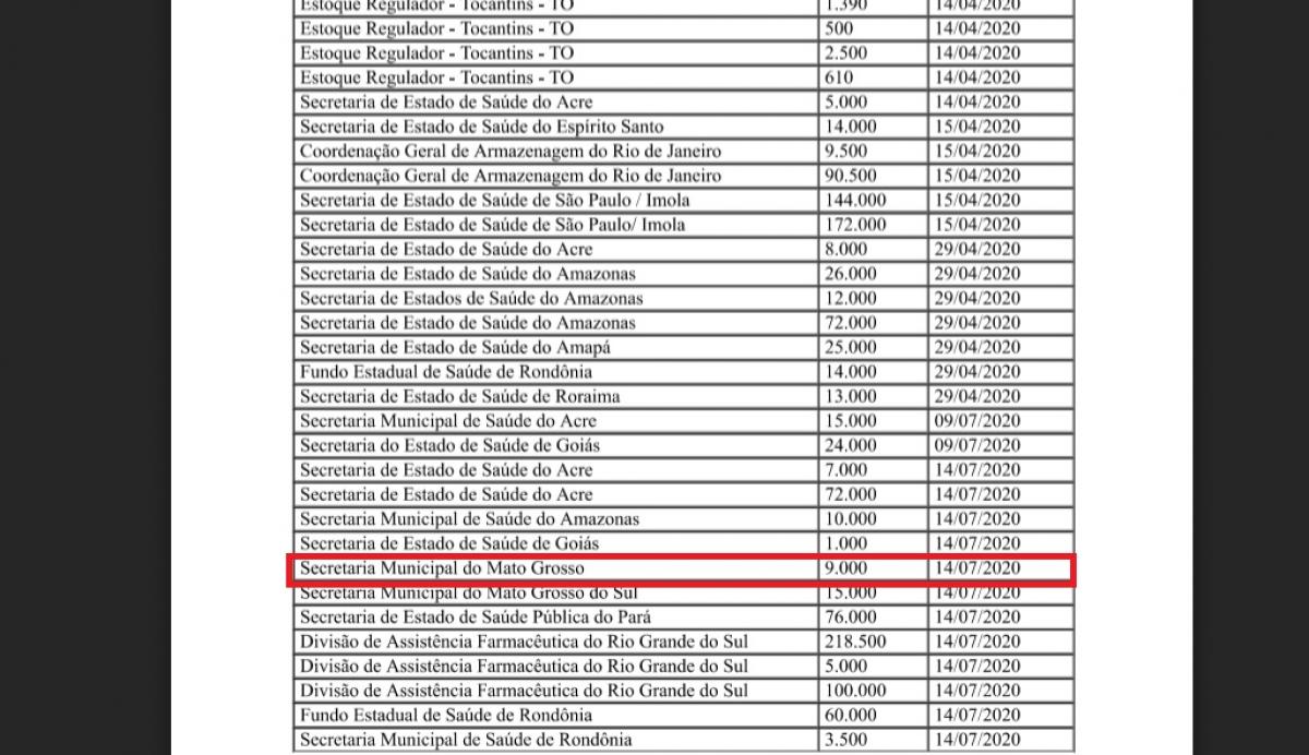 Os dados constam em um ofício e demonstram que as caixas foram enviadas pelo Ministério de Saúde e chegaram ao Estado no dia 19 de julho de 2020, quando Mato Grosso enfrentava o primeiro pico da pandemia com a explosão de casos e mortes.