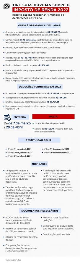 O contribuinte poderá enviar a partir da próxima segunda-feira (7) a declaração do Imposto de Renda 2022. A Receita Federal espera a entrega de 34,1 milhões de documentos até o final do prazo de entrega, em 29 de abril.