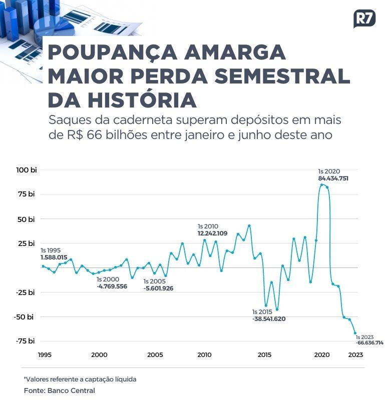 A perda de R$ 66,6 bilhões calculada entre janeiro e junho deste ano é fruto de R$ 1,926 trilhão sacado e R$ 1,860 trilhão depositado na caderneta no período, de acordo com o BC (Banco Central).