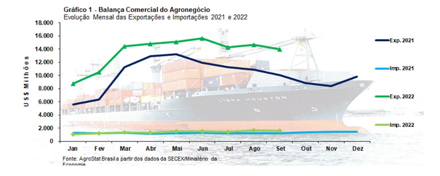 As exportações do agronegócio brasileiro atingiram US$ 13,97 bilhões em setembro. Segundo o Ministério da Agricultura, o valor é recorde para o mês e 38,4% superior ao do mesmo período de 2021.