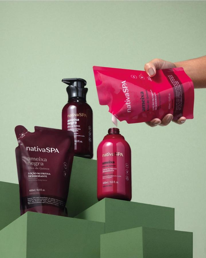 Quando um refil é produzido, utiliza-se uma quantidade menor de plástico em toda a cadeia produtiva: por exemplo, na linha Nativa SPA, o refil de 350 ml utiliza 78% menos plástico do que a embalagem regular de 400ml.
