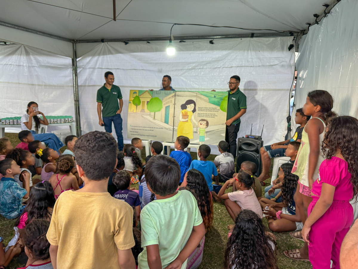 As crianças presentes também participaram da programação com a contação de histórias da Coleção Financinhas, que apresenta conteúdos de educação financeira de forma lúdica e acessível. Um dos destaques foi a versão gigante do livro "Caio achou uma moedinha", desenvolvida com o objetivo de prender ainda mais a atenção do público infantil. Ao final da atividade, cofrinhos foram distribuídos como forma de incentivar o hábito de poupar desde a infância.