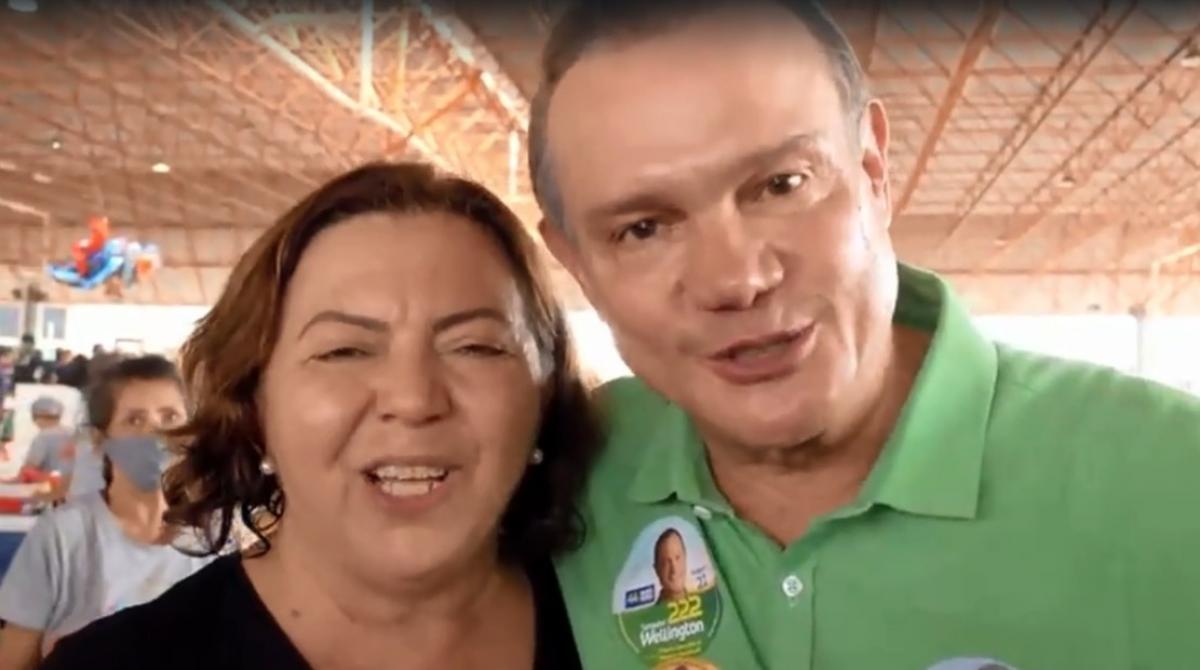 "Estou aqui com a minha deputada federal, dona Neuma, visitando uma feira da agricultura familiar que ela sempre defendeu", diz Fagundes no vídeo. "Preciso do seu voto para deputada e para o senador também", responde a candidata.