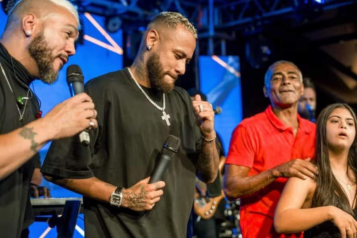 Neymar, que está afastado do Al-Hilal e não vai jogar a Copa América pela seleção brasileira nos Estados Unidos, no meio do ano, compareceu. Enquanto se recupera de uma cirurgia no joelho, o jogador recebeu carinho do campeão mundial de 1994 e até subiu ao palco para cantar.