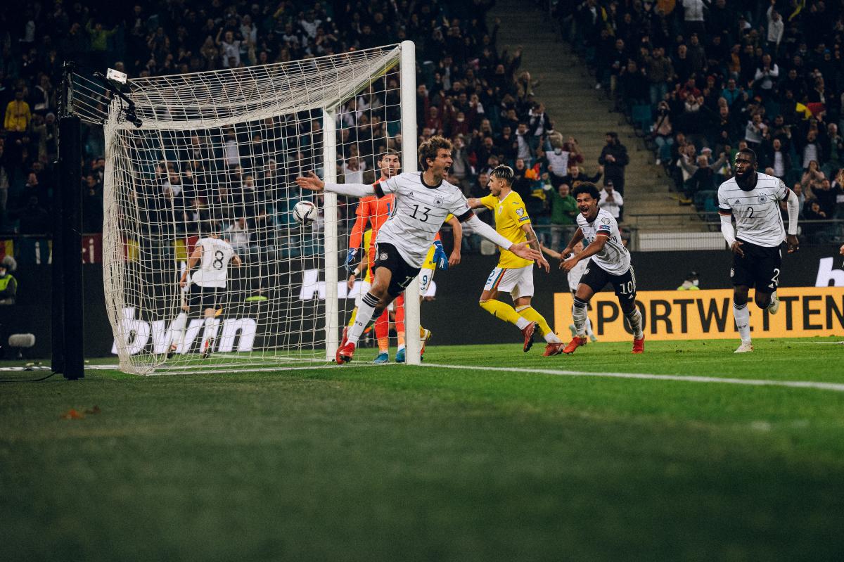 A virada veio apenas aos 35 minutos. Após cobrança de escanteio na área, Goretzka escorou na primeira trave e Müller, oportunista, completou com facilidade na segunda. A Romênia, que já estava abatida em campo, ofereceu pouca resistência e quase nenhuma ameaça à sexta vitória da Alemanha em sete jogos nestas Eliminatórias.