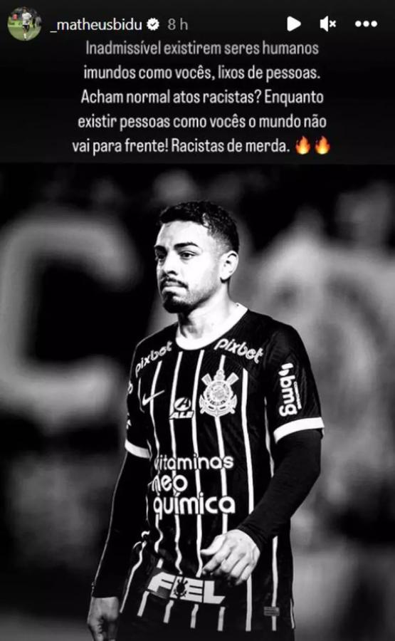 Enquanto Vanderlei Luxemburgo e Róger Guedes pediam desculpas ao Universitario, em coletiva de imprensa, pela comemoração de Ryan que irritou o time peruano, Matheus Bidu desabafava nas redes sociais. Logo após a vitória por 2 a 1 que classificou o Corinthians às oitavas de final da Copa Sul-Americana, em Lima, o lateral-esquerdo fez uma publicação no Instagram para criticar o ato racista cometido pelo preparador físico do Universitario, Sebastián Avellino, e o apoio massivo dado pelo clube e torcedores ao profissional, que está preso em São Paulo.