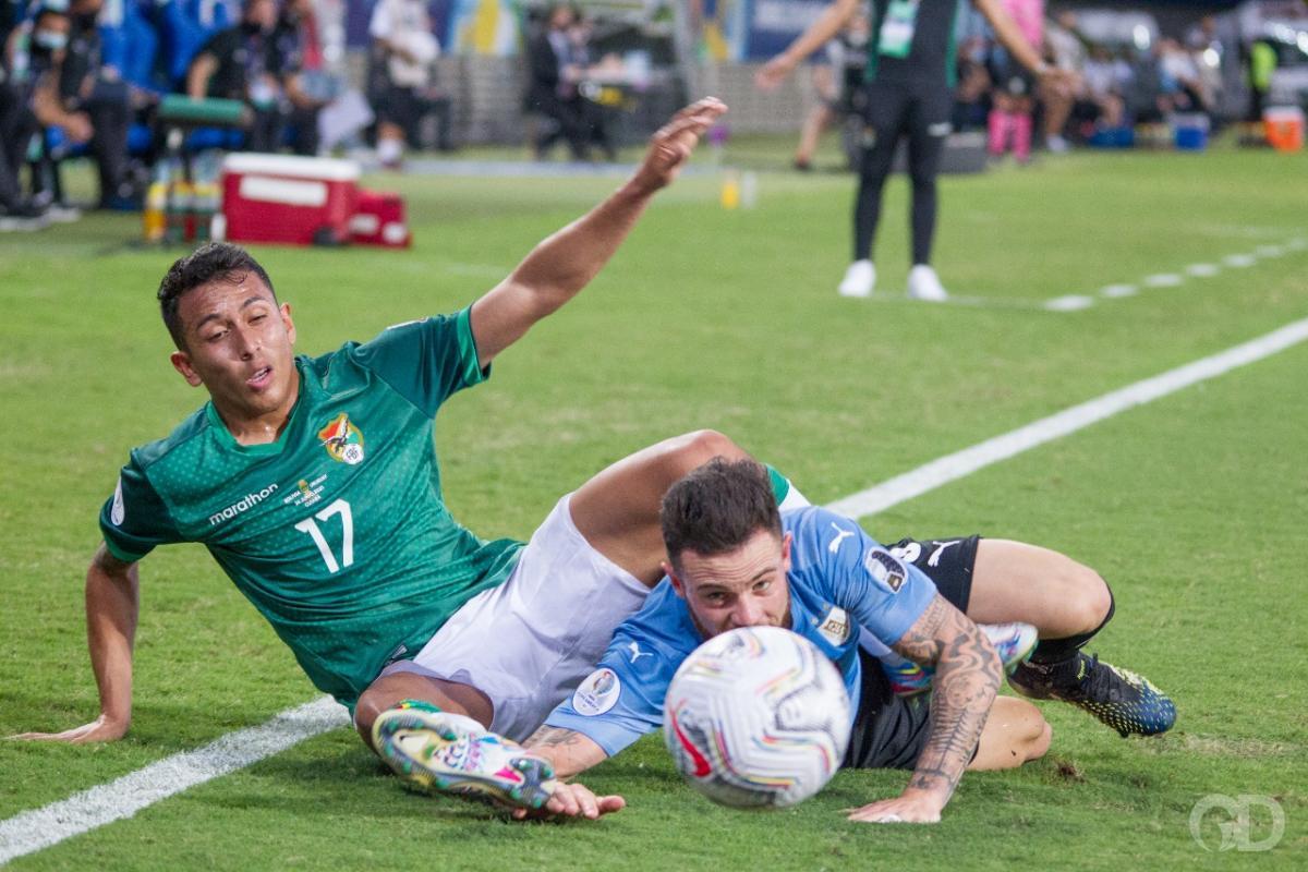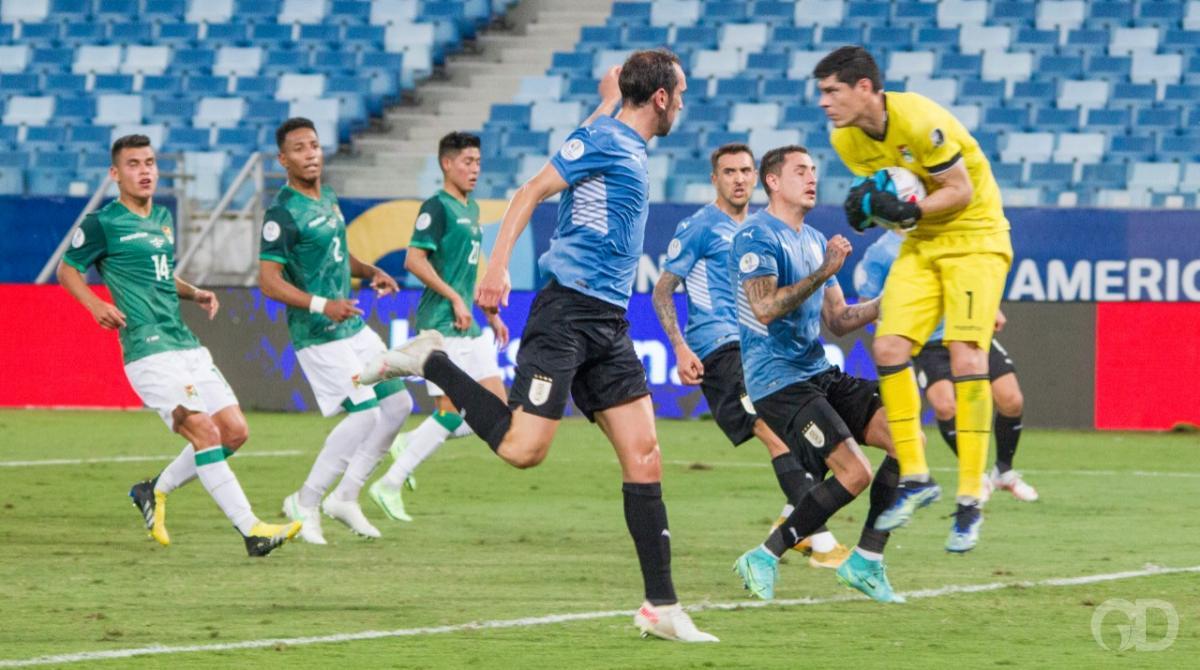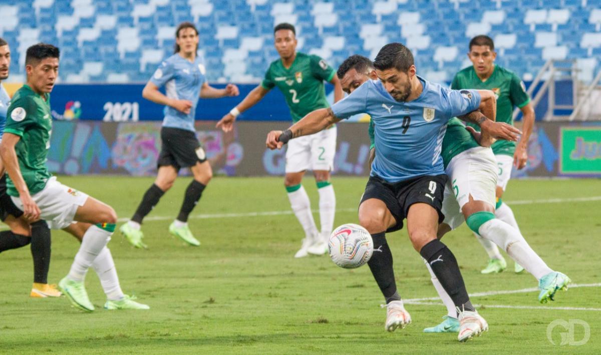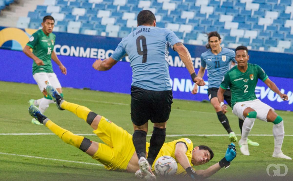 O primeiro tempo na Arena Pantanal foi amplamente dominado pelos uruguaios, que pressionaram os bolivianos a todo instante. As estatísticas registraram 6 finalizações à favor da Celeste e apenas uma para La verde.