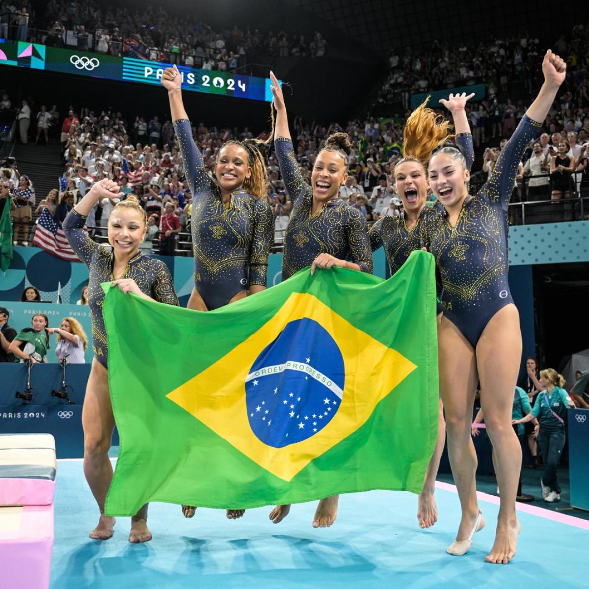A seleção brasileira de ginástica artística alcançou, nesta terça-feira, a sua melhor campanha da história na disputa por equipes em uma edição de Jogos Olímpicos, da melhor forma possível. Rebeca Andrade, Flávia Saraiva, Jade Barbosa, Júlia Soares e Lorrane Oliveira conquistaram a medalha de bronze da Olimpíada de Paris-2024, com pontuação total de 164,49, em disputa vencida pelos Estados Unidos de Simone Biles, principal rival de Rebeca nas futuras finais individuais. As americanas ficaram com 171,296 contra 165,494 da Itália, que ficou com a prata.