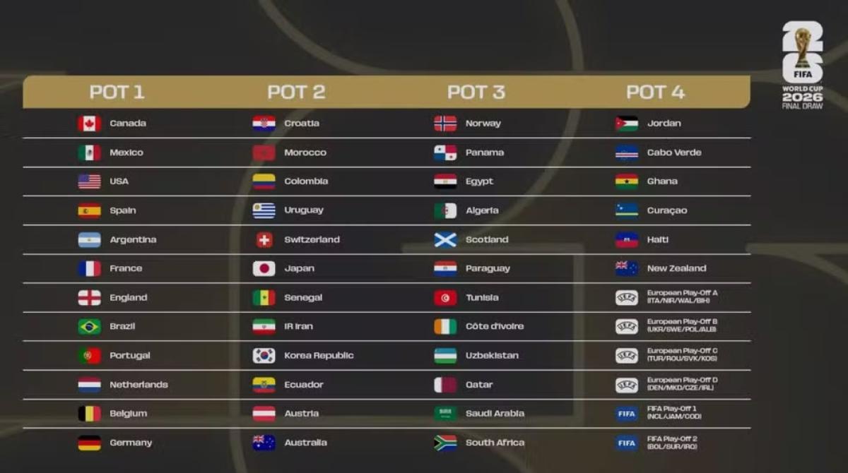 A cerimônia colocará as equipes em quatro potes com base nos rankings mundiais e nas regras continentais. Os três anfitriões estão divididos em grupos separados ao lado das nações mais bem classificadas, como a atual campeã Argentina, Espanha, França e Inglaterra.