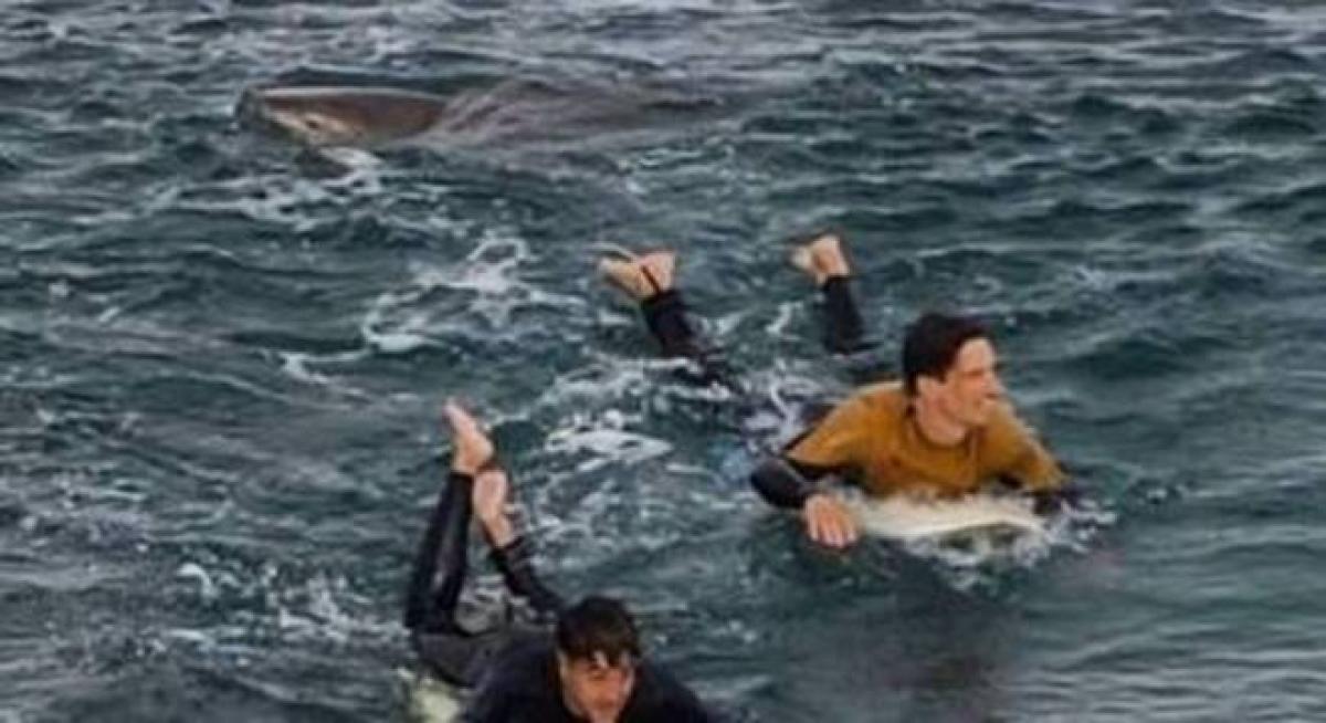 Em um vídeo que circula nas redes sociais, dá para ver o animal nadando perto de dois surfistas que remavam sobre suas pranchas.