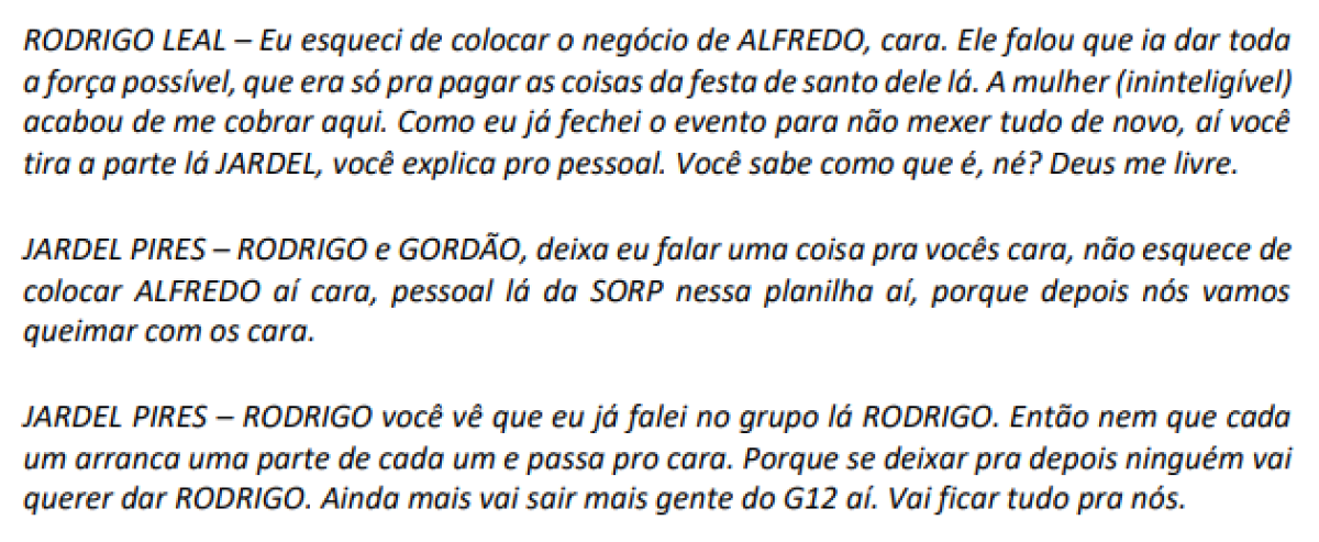Consta nos autos uma conversa de junho de 2022 entre Rodrigo Leal, ex-assessor do vereador Paulo Henrique e uma das peças centrais para os crimes, e Elzyo Jardel Xavier Pires, outro ex-servidor do Legislativo que atuava como promotor de eventos. Na ocasião eles citam um pedido de Benedito para que custeassem as despesas de sua “festa de santo”.