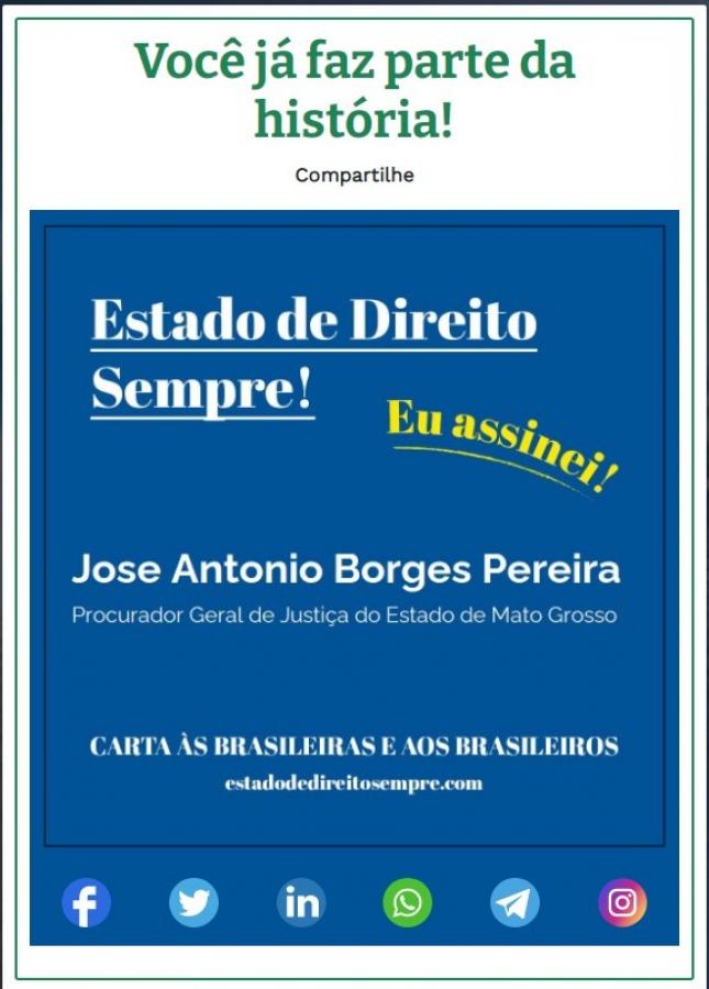 Procurador-geral de Justiça de Mato Grosso, José Antônio Borges, assinou a carta "Estado de Direito Sempre!" que, dentre outros pontos, cobra atenção sobre o processo eleitoral deste ano e cita risco de uma possível ruptura à ordem constitucional.