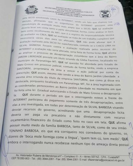“Durante o período em que o interrogando esteve a frente do Intermat participou do pagamento somente de três desapropriações , entre eles a ora investigada, em todas por determinação de Silval Barbosa visando desviar recursos do governo, acreditando que uma desapropriação lícita deveria ser paga via precatório e não diretamente com recurso orçamentário financeiro do Estado”, diz um dos trechos do documento.