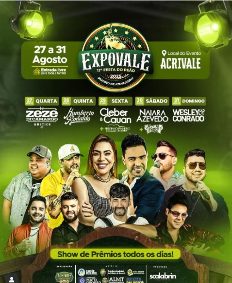 A Justiça determinou a suspensão da 17ª Expovale - Festa do Peão, realizada entre 27 e 31 de agosto, em Peixoto de Azevedo (a 691 km de Cuiabá). A decisão atende a pedido do Ministério Público Estadual (MPMT), que considera desproporcional o gasto com entretenimento comparado aos investimentos com serviços básicos aos cidadãos. O evento tem orçamento de R$ 2,2 milhões, pagos pela prefeitura e parceiros.