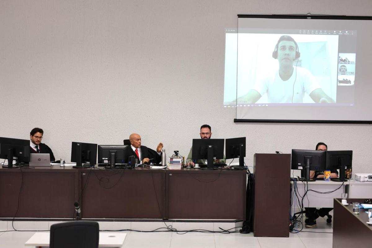 Após a pausa para o almoço, o julgamento foi retomado às 13h35. O réu participou por videoconferência da Penitenciária Central do Estado (PCE).