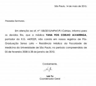 No entanto, a Coordenadoria Geral da Comissão de Residência Médica (Coreme), da USP São Paulo, negou a informação. A instituição afirmou que os dados de Yana “não constam em nos registros de pós-graduação senso lato Residência Médica da Faculdade de Medicina da Universidade de São Paulo”.