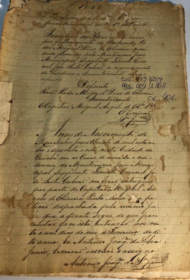 O ano de 1868 é simbólico para Cuiabá, pois é a data com os registros mais antigos do Poder Judiciário estadual. Um dos processos desta época, do mês de fevereiro, trata sobre a herança do padre Miguel Dias de Oliveira. O inventariante e herdeiro foi o capitão Miguel Angelo de Oliveira Pinto, que era genro do padre. Naquela época mulheres não podiam ter bens. Já padres não poderiam casar e ter filho, naquela época e agora.